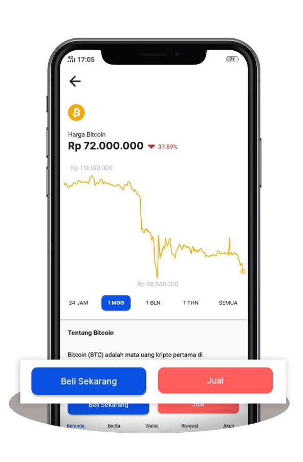 Pilih aset crypto yang ingin Anda beli / jual di daftar aset crypto di halaman beranda. Anda juga dapat mengakses fitur beli / jual crypto di kartu dompet atau di halaman dompet crypto.